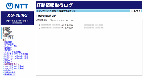 表示番号 取得日時 結果 要因 経路情報バージョン
