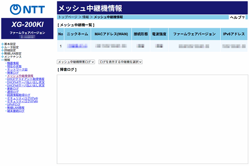 [メッシュ中継機障害ログ]もしくは[メッシュ中継機更新ログ]を表示したいメッシュ中継機のMACアドレスを選択します。