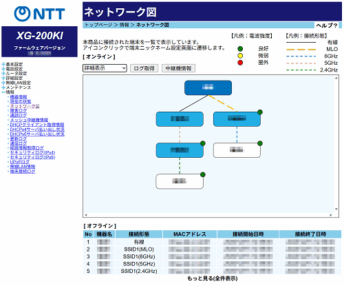 メッシュ親機、接続中のメッシュ中継機、接続中の端末を表示します。