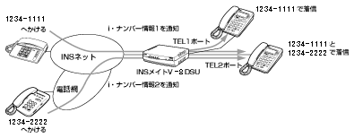 ご利用パターンと設定方法 例:ひとつめの電話番号(06-1234-1111:契約者回線番号)での着信はTEL1、TEL2ポート両方に、ふたつめの電話番号(06-1234-2222:追加番号)での着信はTEL2ポートのみとする場合