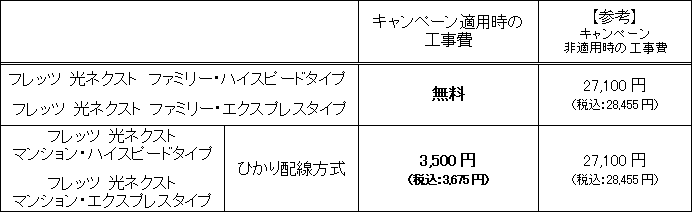 品目の変更(例:「フレッツ・光プレミアム」から「フレッツ 光ネクスト」、「フレッツ 光ネクスト ファミリータイプ」から「フレッツ 光ネクスト ファミリー・ハイスピードタイプ」への変更等)に係わる工事費は割引対象外です。 |