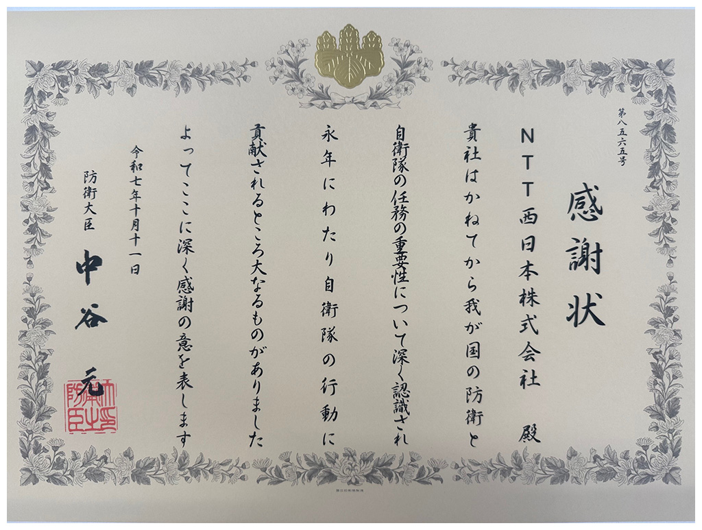 NTT西日本株式会社(代表取締役社長:北村亮太、以下、NTT西日本)は、防衛相・自衛隊との災害時における通信の確保のための相互協力への取り組みに対し、「令和7年度防衛大臣感謝状贈呈式」において防衛大臣より感謝状を受贈しました。