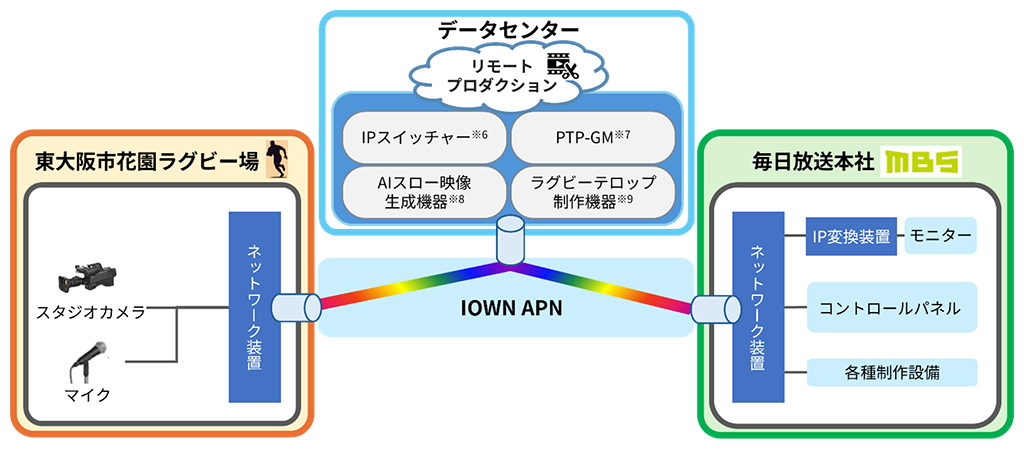本取り組みでは、NTTスマートコネクトのデータセンターと東大阪市花園ラグビー場および毎日放送本社を、IOWN APNの技術を活用した「All-Photonics Connect powered by IOWN」※5にて接続した上で、中継制作の核となる主要な制作機能(IPスイッチャー※6、PTPグランドマスター※7)をデータセンターに集約しました。この環境を用いて毎日放送本社から、IOWN APNの超低遅延ネットワークを通じてデータセンター上の制作システムを遠隔操作することで、スイッチャーやミキサー担当者が現場にいなくとも地上波放送向けの高品質な番組制作が可能であることを実証しました。