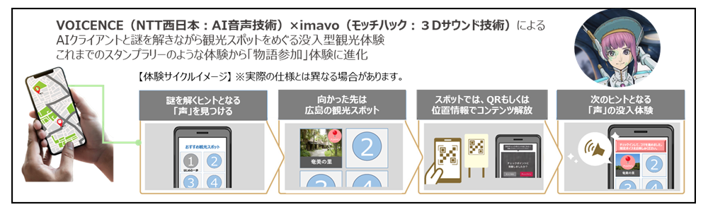 本施策は、NTT西日本株式会社(以下「NTT西日本」)が、音声AI事業「VOICENCE」※1を活用した企画全体のプロデュースに加え、人気声優でありバーチャルYouTuber・キズナアイのボイスモデルも務める春日 望さんのAI音声制作を担当します。また、株式会社モッチハック(以下「モッチハック」)は、独自開発した、音の臨場感や人の存在感を360度にわたり表現するイマーシブ3Dサウンド「imavo™」を用い、ARG※2型デジタルラリーのコンテンツ企画・制作および技術提供を行います。