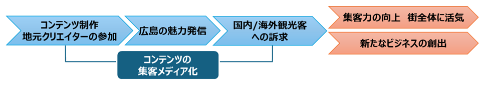 本コンテンツが広島市街をめぐる動機付けとなり、新技術体験(デジタルラリー+AI自動生成音声+立体音響)の話題化・聖地化や、SNSでの謎解きの考察などユーザ生成コンテンツの自然発生と拡散を図ります。本コンテンツ自体の集客メディア化による、観光客の増加や今後の拡張性(新規/リピーターの獲得)につなげます。