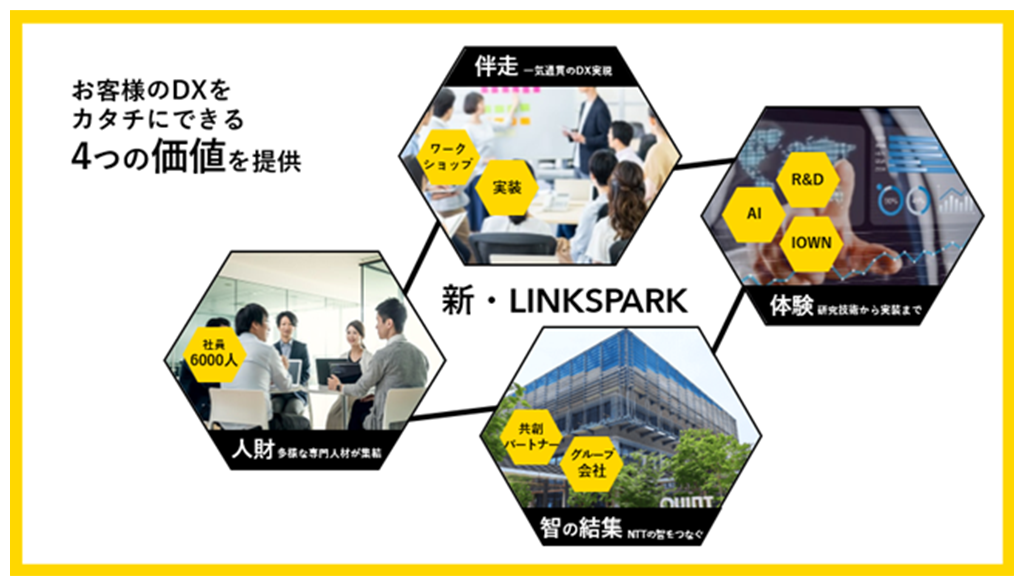 LINKSPARKはHUBとしての役割を担い、QUINTBRIDGE※1をはじめとしたイノベーション拠点を通じた共創パートナーとの出会いやQUINTBRIDGEなどでうまれた社会課題のNTT西日本による実装を実現します。