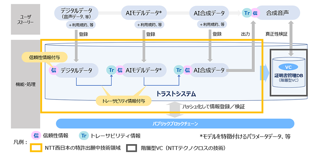 音声等の原音データ→AIモデルの特徴データ→合成AIデータの関係を階層型VC※3で連結し、生成物の出自を技術的に追跡可能とします。