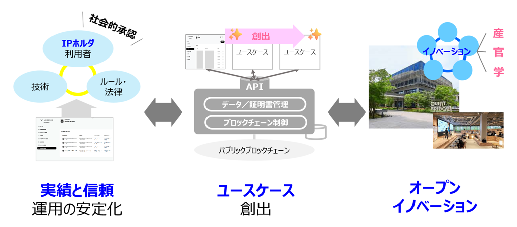 デジタルデータ(音声等の原音データ・AIモデルの特徴データ・合成AIデータ)と発行主体・利用許諾等の条件をVCとして保存し、改ざん検知可能なハッシュ値をパブリックブロックチェーンへ記録することで、第三者による検証を可能とします。