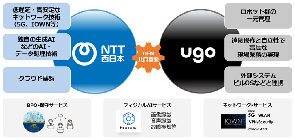 こうした背景を踏まえNTT西日本グループとugoは様々なプロジェクトでの協業を経て、2025年10月27日にugo Platformをベースとしたマルチロボティクスプラットフォームの提供を発表※4し、2025年10月29日にNTT西日本とアイリスオーヤマ株式会社との業務提携に関する基本合意※5を実現してきました。