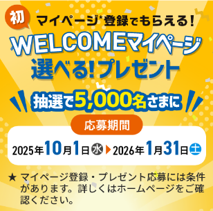 - 個人のお客さま向けの「マイページ」をご登録された方が対象になり、ビジネスマイぺージは対象外です。 ただし法人での契約の方も「マイページ」登録および本プレゼント施策へのご応募可能です。