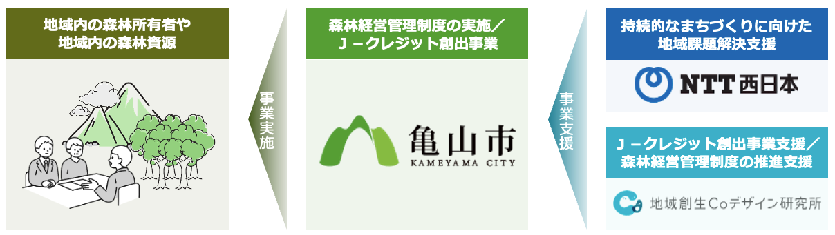 亀山市では、整備された森林から創出されたJ―クレジットを金融機関やパートナー企業と連携・活用し、地域内でのカーボン・オフセットの推進をめざすとともに、都市部へのクレジット流通も視野に入れた取組みを進めています。また、都市部へのクレジット流通を通じた資金還流や関係人口の増加を図り、経済循環モデルの構築をめざしています。さらにNTT西日本グループでは、この取組みを全国に展開させていくことで、森林経営管理制度のさらなる推進に加え、森林・林業分野の課題解決と2050年カーボンニュートラルの実現に貢献し、持続可能な地域づくりをめざしていきます。
