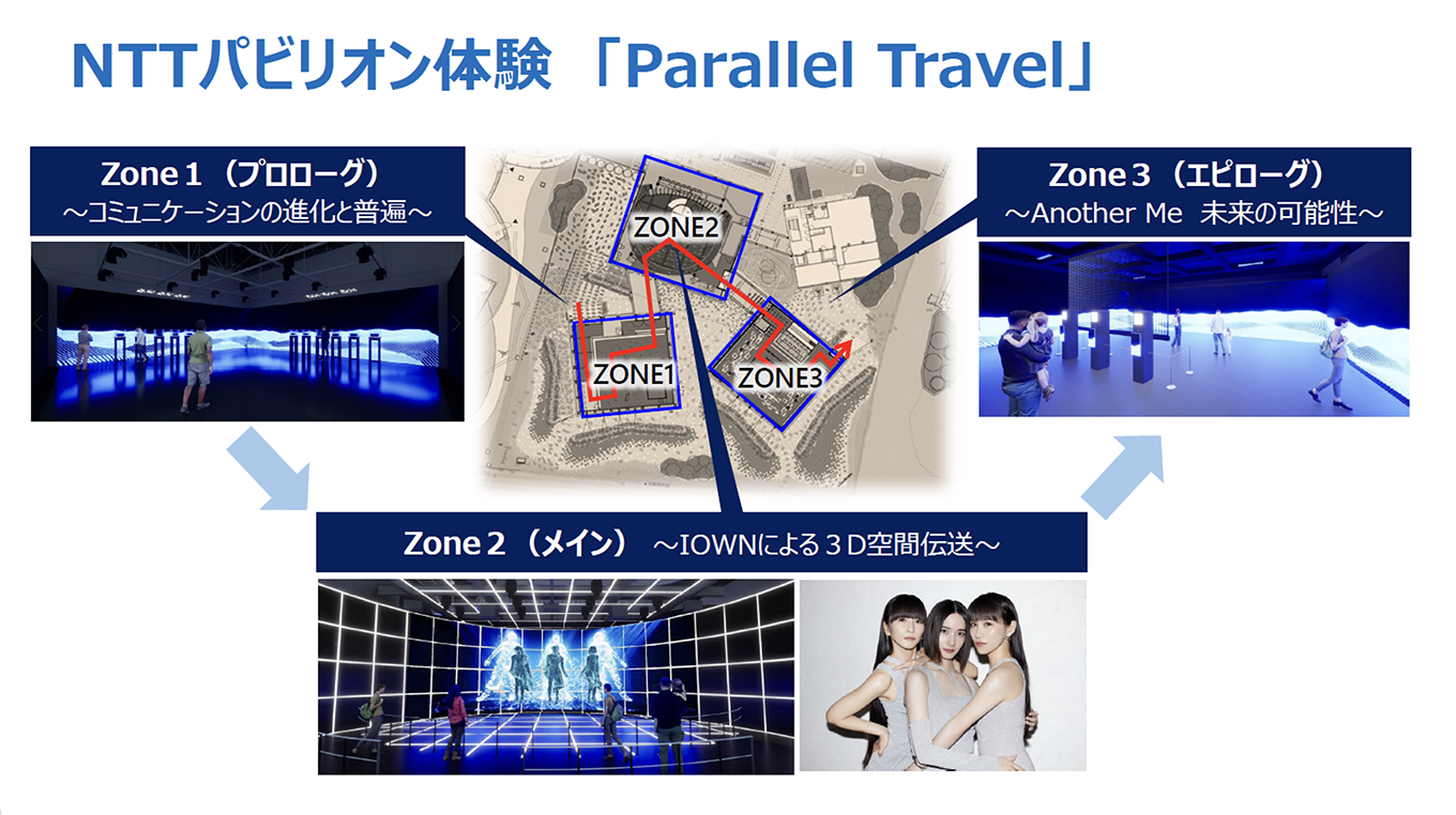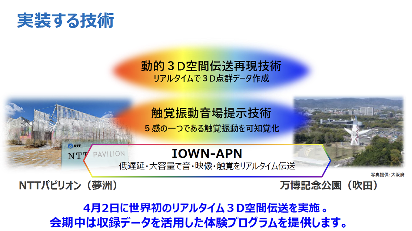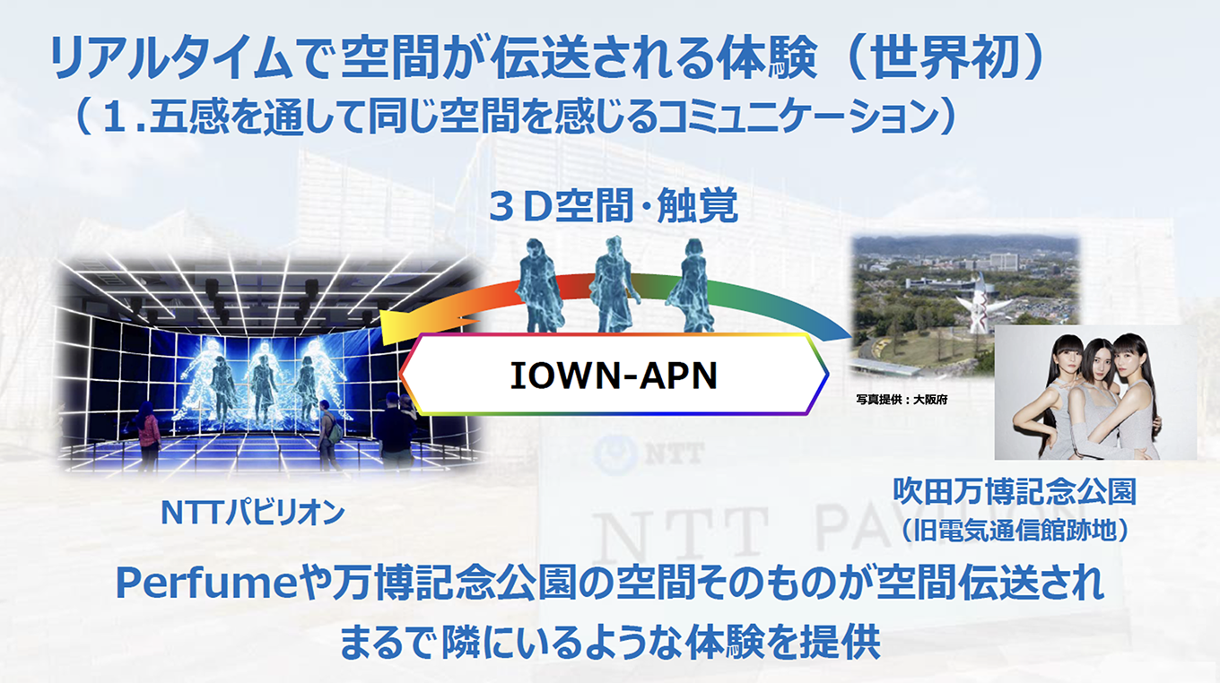 大阪・関西万博では、NTTグループとしてパビリオンを出展しました。過去の万博では、電話・映像・ワイヤレス通信といった歴史的な体験を提供してきましたが、今回は次世代情報通信基盤IOWNがそれにあたります。特に、IOWNを構成する主要技術分野の1つであるAPN技術は、高速・低遅延、省エネルギーを実現する未来の通信技術です。パビリオンを通じて、映像や音声だけではなく、離れた空間そのものや、離れた場所にいる人・ものの感覚を共有する体験を提供しました。