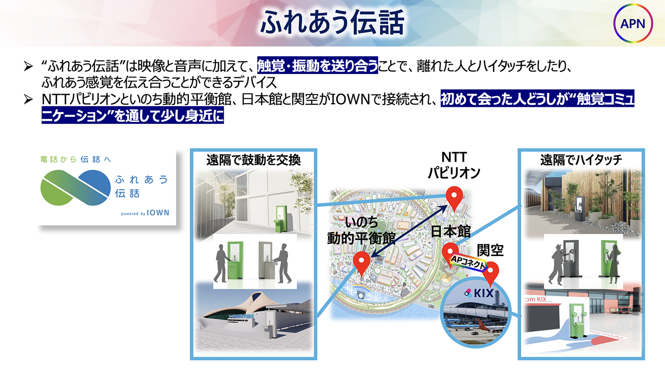 また、「ふれあう伝話」と題し、映像と音声に加えて、触覚・振動も体感できるコミュニケーションツールを万博会場に設置しました。これにより、会場外にいる方々にもIOWNの魅力を体験していただける機会を提供し、会場への来場促進にもつながる取組みとなりました。