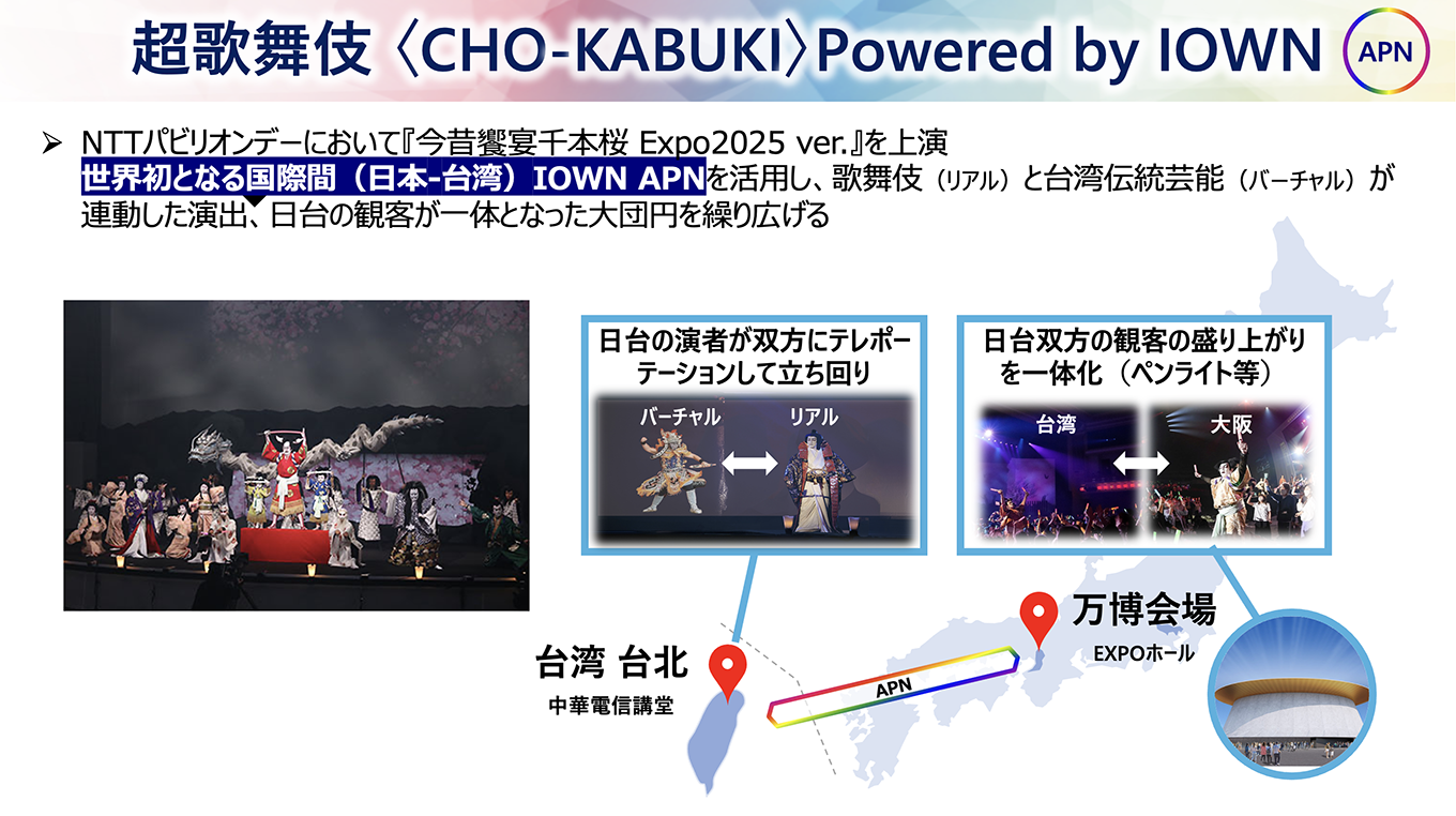 NTTグループとしては、5月24日、25日を「NTTパビリオンデー」にて、「超歌舞伎 〈CHO-KABUKI〉Powered by IOWN 『今昔饗宴千本桜 Expo2025 ver.』」を上演しました。当日は、IOWN APNを活用し、日本と台湾を結ぶ世界初となる国際間接続を成功させることができました。最先端のICTと日本の伝統芸能を融合させることで、新たな価値の創出を実現しました。