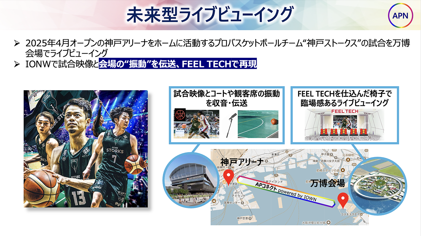 このほか、IOWNと「FEEL TECH」を組み合わせた「未来型ライブビューイング」を開催しました。FEEL TECHは、相手の感じ方に合わせて感覚を変換し共有する新たな技術であり、新しいコミュニケーションのかたちとして注目されています。イベント当日は、神戸アリーナと万博会場をIOWNで接続し、映像・音声・触覚をリアルタイムで共有する新たな観戦体験を実現しました。