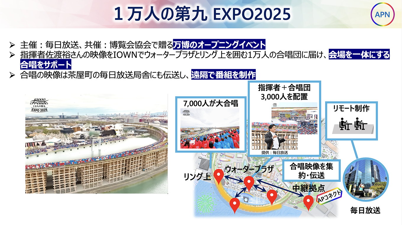 開幕初日のオープニングイベントとして開催された「1万人の第九 EXPO2025」では、IOWNの技術を活用し、オーケストラの音声を遅延なく1万人に届ける施策を実施しました。万博会場が一体になった合唱をサポートするだけでなく、株式会社毎日放送による映像中継も支援しました。