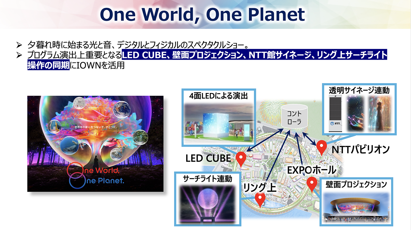 NTT西日本グループは、IOWNを万博会場全体にメッシュ状に張り巡らせた「IOWN APNキャンパスネットワーク」の構築・保守を受託し、実施しました。このネットワークは、万博の開催期間中に毎日実施された主催者公式企画催事「One World, One Planet」を支える通信インフラとして機能し、会場内のあらゆる場所で同一の映像を安定して配信しました。