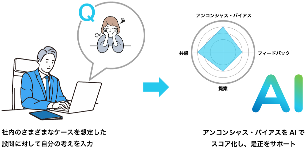 NTT西日本グループのNTTビジネスソリューションズは、生成AIを活用したアンコンシャス・バイアスチェック&トレーニングツール「karafuru AI(カラフルAI)」を提供しています。「karafuru AI」は、職場でよくある1on1のシーンを題材に、AI相手にトレーニングを行います。そして回答内容をAIがその場で「アンコンシャス・バイアスに配慮できているか」「共感を示しているか」など、4つのポイントでフィードバックし、これらを繰り返しトレーニングすることで、利用者の内省と行動変容を促進します。