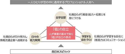 NTT西日本グループは、社員一人ひとりがプロフェッショナル人材へと成長していけるよう、“「個」の自立”に向けた能力開発を推進しています。社員が自らキャリアを描き、主体的に学び続けられるよう、学習環境や支援制度等の環境を整備しています。また、通常業務の評価に加え、挑戦に関する目標設定に対する評価制度も導入し、社員の意欲と成長を後押ししています。
