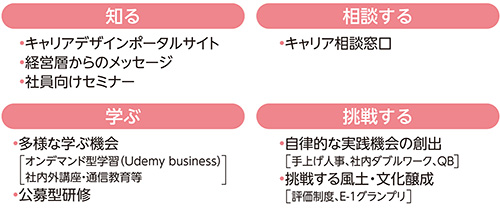 「知る」:経営層からのメッセージやセミナー、イベント活用により、自律的キャリア形成に向けたモチベーション向上を図っています。また、制度や研修情報を一元的に掲載した「キャリアデザインポータルサイト」を提供し、社員が必要な情報にすぐにアクセスできる環境を整えています。